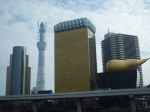 | 浅草、吾妻橋から建設中の新東京タワー「スカイツリー」を望む。ところで金色のビルの隣、筋斗雲みたいなモニュメントの正体は・・・ |