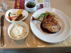 さて、今日は11月22日と言う事で・・・語呂合わせ記念日、11(いい)22(ふうふ)で「いい夫婦の日」です。特にそういう事を意識したワケでは無いのですが、真由美先生にとって発表会前と言う事もあり、またそれとは別にワタクシの仕事の関係もここの所バタバタと忙しくなってきてますので、二人して仕事に向けて「気合い入れ」(景気づけ?)と言う事で、今日のお昼は、久し振り(一年ちょっと振り)に岩見沢市は栗丘の「夕日ヶ丘レストラン善生」さんに行ってランチを食べて来ました。まぁ~「ご飯を食べる」ことが気合いや景気づけに繋がるかどうかわかりませんが(笑)。レストランは、多くのお客様、特にご婦人たちが多く、相変わらず繁盛してました♪以前来た時は、「夕日ヶ丘オリジナルランチ」(じっくり煮込んで焼き上げた道産牛肉、ソースはご飯に合う味噌ベースのデミグラスをかけて、付け合わせは地元で採れた野菜を使用・・・以上、メニューに書いてあった説明)を頂きましたが、今日は「本日のメインランチ」と記されたもので、お肉のランチとお魚のランチがあったのですが、お肉で・・・「骨付き鶏モモ肉のミラノ風カツレツ」なるものを頂きました♪なかなか美味しゅうございました。ご飯はおかわりOKですが、腰も完治してない中、食べ過ぎてお腹を重たくしたら腰にくるかもしれないですし(笑)、今日は遠慮しました(*^^*)ァハ